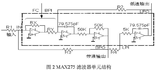 其内部的一个二阶节单元如图2所示。当用于低通滤波时用LPO作为输出,当用于带通滤波时用BPO作为输出。二阶节的中心频率Fo、Q值及放大倍数由外接电阻R1、R2、R3、R4决定。当中心频率Fo、Q值及增益确定后,R1、R2、R3、R4可由下列等式得到(所得电阻值单位均为 ):